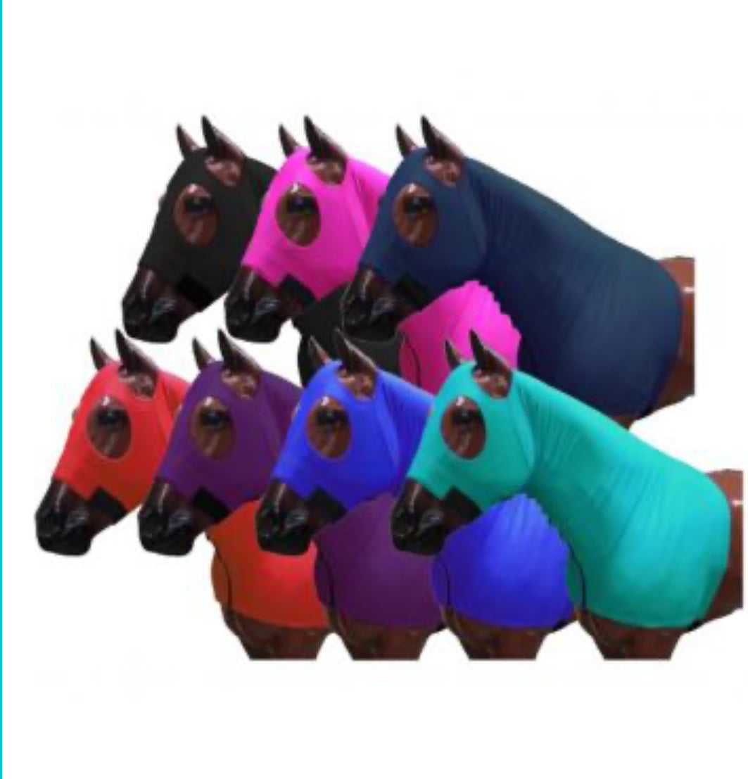 Showman ® Lycra Mesh zipper slicker hood. This form fitting slicker is constructed of Lycra mesh and features a zipper neck. Fleece lined nose with Velcro closure and Velero strap behind front legs.