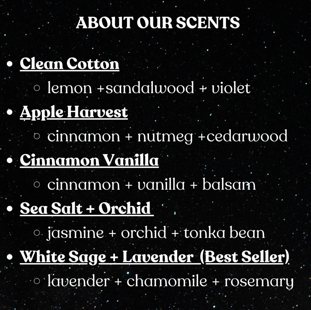 White Sage + Lavender: Scent profile includes lavender on the top with complimenting camphor, chamomile, sage and rosemary, with sandalwood and cedar-wood base.